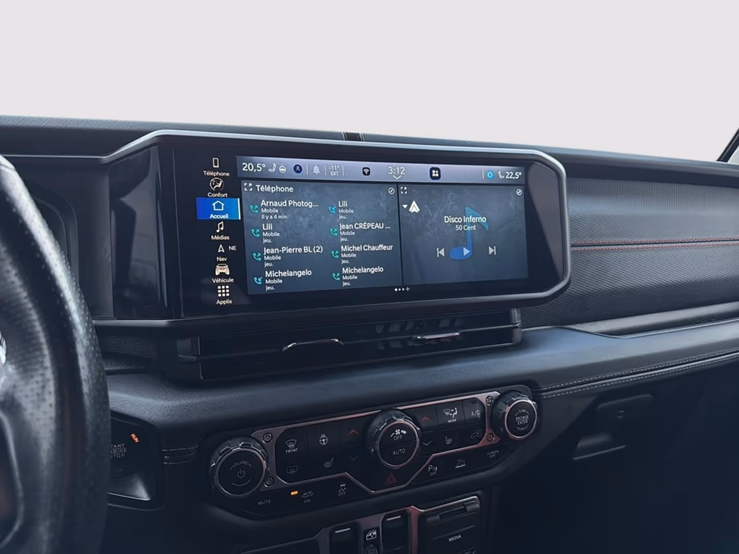 WRANGLER RUBICON 392 4 PORTES 2024V8 HEMI 64 L. ADN extrême. Performance légendaire.Disponible dès maintenant chez Blainville Chrysler ce Wrangler Rubicon 392 2024 4 portes en Noir avec intérieur noir et sièges rouges en cuir Nappa incarne la version la plus radicale et performante du Wrangler. Propulsé par le moteur 64 L SRT HEMI V8 et équipé d’un rouage 4x4 avancé il est conçu pour dominer autant la route que les sentiers les plus exigeants.MOTORISATION ET TRANSMISSIONMoteur SRT HEMI® V8 64 L avec FuelSaver MDS;Transmission automatique 8 vitesses TorqueFlite®;Système 4x4 Selec-Trac® pleine durée (rapport 272:1);Mode Off-Road Plus;Essieu avant Dana M210 HD large;Essieu arrière Dana M220 large flottant;Différentiels verrouillables électroniques avant et arrière;Barre antiroulis avant à déconnexion électronique;Plaque de protection transmission;Plaque de protection réservoir de carburant;Plaque de protection boîte de transfert;Pare-chocs avant et arrière en acier;Attelage de classe II;Faisceau de câblage 4 et 7 broches;4 interrupteurs auxiliaires intégrés.SÉCURITÉ ET AIDES À LA CONDUITEAlerte de collision avant Plus avec freinage actif;Régulateur de vitesse adaptatif avec fonction arrêt;Surveillance des angles morts et détection de circulation transversale arrière;Aide au stationnement arrière Park-Sense®;Commande automatique des phares de route;Sacs gonflables avant multimodes évolués;Sacs gonflables latéraux intégrés aux sièges avant;Sacs gonflables latéraux supplémentaires;Alerte rappel pour banquette arrière;Système d’alarme de sécurité;Entrée sans clé avec téléverrouillage de proximité;Démarreur à distance;Rétroviseurs extérieurs chauffants à commande électrique;Alerte de remplissage de pneus sélectionnable.CONFORT ET TECHNOLOGIESièges en cuir Nappa à réglages électriques;Sièges avant chauffants;Volant chauffant;Volant sport avec palettes de changement de vitesses;Climatisation automatique bizone;Uconnect® 5 NAV avec écran tactile 123 pouces;Apple CarPlay et Google Android Auto;SiriusXM avec contenu 360L;Système audio Alpine® haut de gamme;Pages de renseignements hors route;Caméra hors route intégrée;Prise de courant auxiliaire 115 V;Ouvre-porte de garage universel;Moquette acoustique avant;Vitre avant et glaces avant laminées acoustiques;Trousse d’outils Torx pour retrait du toit et des portes.ENSEMBLES ET OPTIONSTapis toutes saisons Mopar®;Couleur extérieure Noir.UN WRANGLER SANS COMPROMISLe Wrangler Rubicon 392 2024 est la définition même de la performance extrême dans un format iconique. Son V8 atmosphérique ses composantes hors route renforcées et son intérieur haut de gamme en cuir Nappa en font un véhicule unique aussi exclusif que spectaculaire.Acheter en toute confiance chez Blainville ChryslerInspection certifiée;Tout type de financement possible — aucun cas de refus;Garantie prolongée disponible;Échange accepté.Disponible dès maintenant chez Blainville Chrysler.Les tarifs et informations présents sur notre site www.blainvillechrysler.ca sont à jour et prioritaires. Les prix affichés sur des sites externes peuvent être sujets à un délai de mise à jour et ne constituent pas un engagement contractuel.Nous sommes ouverts les samedis. Nous parlons anglais aussi.