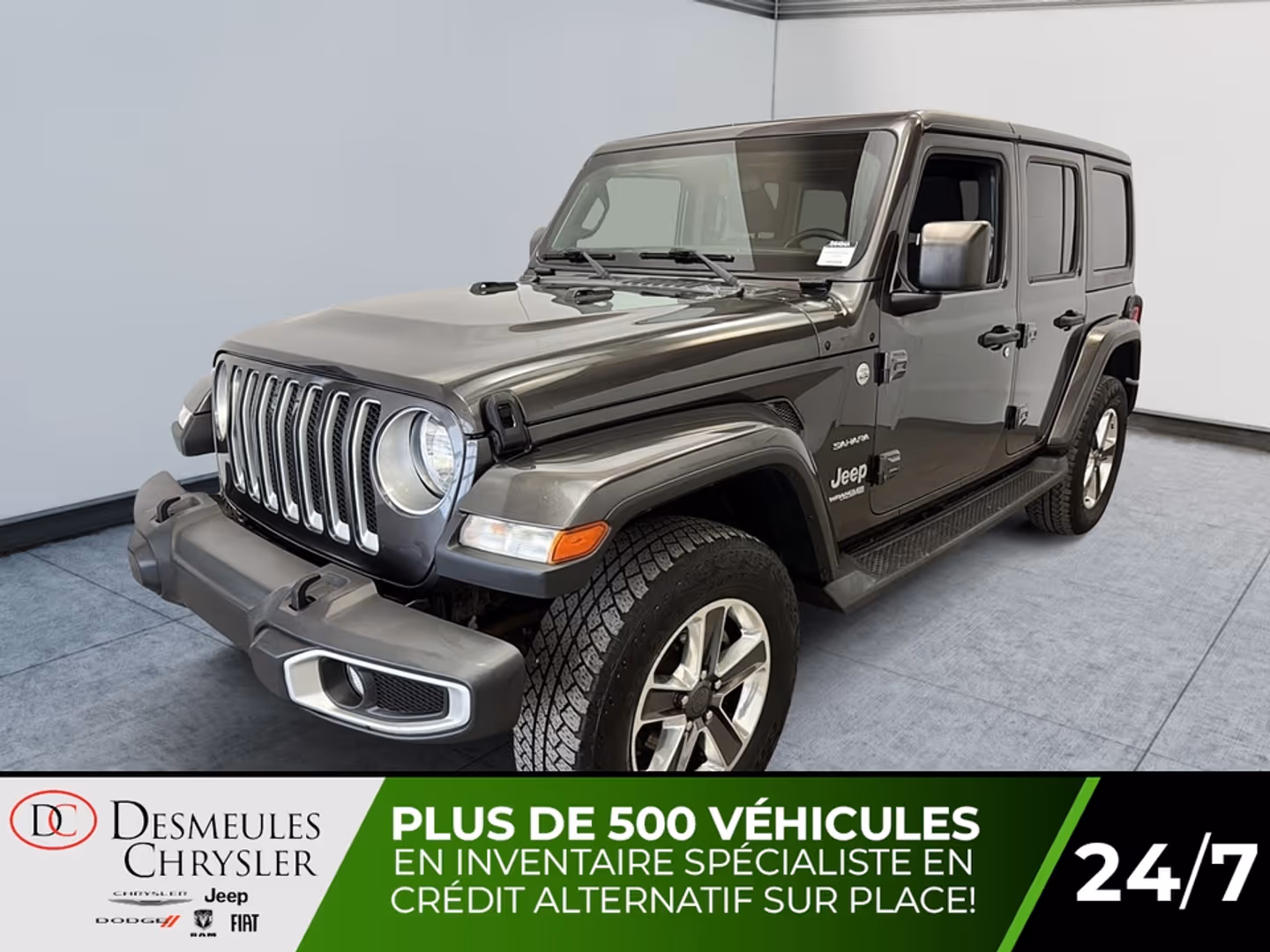 Jeep Wrangler Unlimited Sahara V6 2020CARACTÉRISTIQUES PRINCIPALES• Moteur V6 Pentastar 3.6 L• Environ 285 chevaux et 260 lb-pi de couple• Transmission automatique 8 vitesses TorqueFlite• Système de traction intégrale 4x4 Command-Trac• Capacité de remorquage pouvant atteindre environ 3 500 lb• Conception robuste et capacités hors route reconnues• Habitacle spacieux et polyvalent pour 5 passagersÉQUIPEMENTS DISTINCTIFS• Système multimédia Uconnect avec écran tactile• Apple CarPlay et Android Auto• Caméra de recul ParkView• Climatisation automatique• Volant multifonction gainé de cuir• Démarrage à distance• Toit rigide Freedom Top amovible• Portes amovibles et pare-brise rabattable• Éclairage extérieur à DEL• Jantes en alliage aluminium Sahara• Régulateur de vitesse• Surveillance des angles morts• Assistance au stationnement arrièreACHETER EN TOUTE CONFIANCE CHEZ DESMEULES CHRYSLER• Inspection complète par nos techniciens certifiés• Financement disponible sur place• Garantie prolongée disponible• Échange accepté• Jusqu’à 90 jours sans paiements (selon admissibilité)Disponible dès aujourd’hui chez Desmeules Chrysler.Les tarifs et informations présents sur notre site desmeuleschrysler.ca sont à jour et prioritaires. Les prix affichés sur des sites externes peuvent être sujets à un délai de mise à jour et ne constituent pas un engagement contractuel.Nous sommes ouverts les samedisTout type de financement possible aucun cas de refusNous parlons anglais aussi
